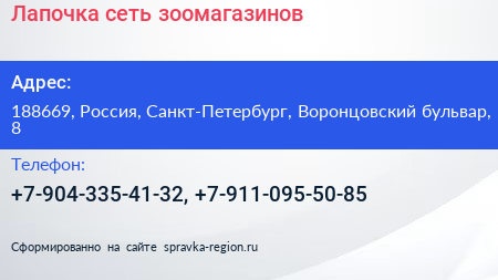 Лапочка, сеть зоомагазинов по адресу 188669, Россия, Санкт-Петербург, Воронцовский бульвар, 8 в дальнейшем Организация, размещена в следующих категориях: