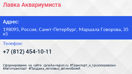 Лавка Аквариумиста по адресу 198095, Россия, Санкт-Петербург, Маршала Говорова, 35 к5 в дальнейшем Организация, размещена в следующих категориях: