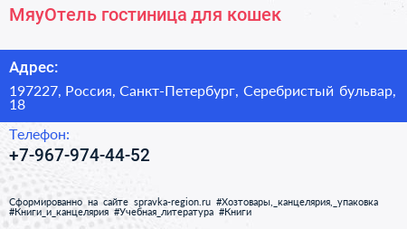 МяуОтель, гостиница для кошек по адресу 197227, Россия, Санкт-Петербург, Серебристый бульвар, 18 в дальнейшем Организация, размещена в следующих категориях: