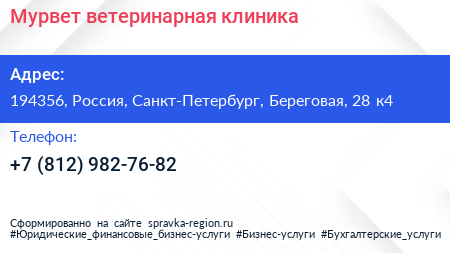 Мурвет, ветеринарная клиника по адресу 194356, Россия, Санкт-Петербург, Береговая, 28 к4 в дальнейшем Организация, размещена в следующих категориях: