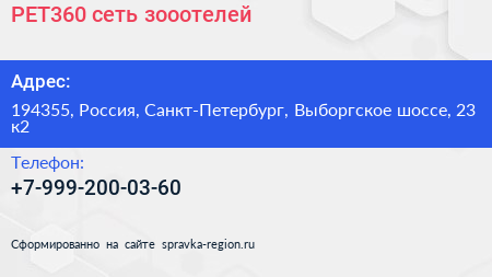 PET360, сеть зооотелей по адресу 194355, Россия, Санкт-Петербург, Выборгское шоссе, 23 к2 в дальнейшем Организация, размещена в следующих категориях: