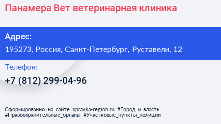 Панамера Вет, ветеринарная клиника по адресу 195273, Россия, Санкт-Петербург, Руставели, 12 в дальнейшем Организация, размещена в следующих категориях: