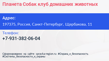 Планета Собак, клуб домашних животных по адресу 197375, Россия, Санкт-Петербург, Щербакова, 11 в дальнейшем Организация, размещена в следующих категориях: