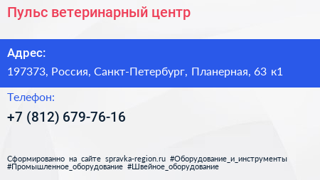 Пульс, ветеринарный центр по адресу 197373, Россия, Санкт-Петербург, Планерная, 63 к1 в дальнейшем Организация, размещена в следующих категориях: