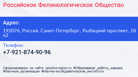 Российское Фелинологическое Общество по адресу 192076, Россия, Санкт-Петербург, Рыбацкий проспект, 18 к2 в дальнейшем Организация, размещена в следующих категориях: