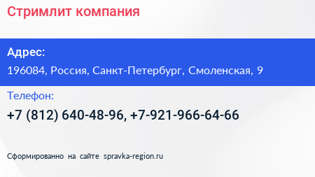 Стримлит, компания по адресу 196084, Россия, Санкт-Петербург, Смоленская, 9 в дальнейшем Организация, размещена в следующих категориях: