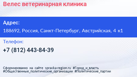Велес, ветеринарная клиника по адресу 188692, Россия, Санкт-Петербург, Австрийская, 4 к1 в дальнейшем Организация, размещена в следующих категориях:
