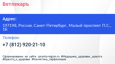 Ветлекаръ по адресу 197198, Россия, Санкт-Петербург, Малый проспект П.С., 1Б в дальнейшем Организация, размещена в следующих категориях: