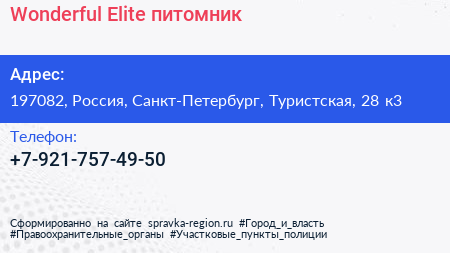 Wonderful Elite, питомник по адресу 197082, Россия, Санкт-Петербург, Туристская, 28 к3 в дальнейшем Организация, размещена в следующих категориях: