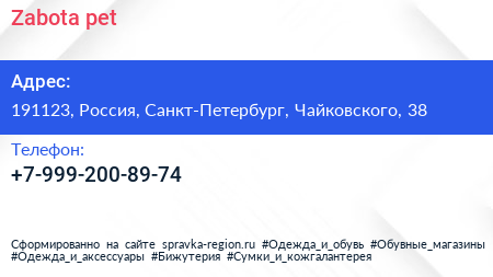 Zabota pet по адресу 191123, Россия, Санкт-Петербург, Чайковского, 38 в дальнейшем Организация, размещена в следующих категориях: