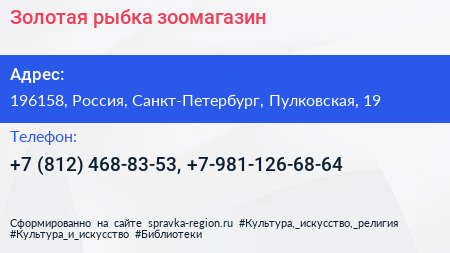 Золотая рыбка, зоомагазин по адресу 196158, Россия, Санкт-Петербург, Пулковская, 19 в дальнейшем Организация, размещена в следующих категориях: