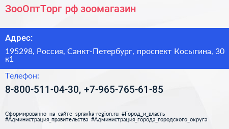 ЗооОптТорг.рф, зоомагазин по адресу 195298, Россия, Санкт-Петербург, проспект Косыгина, 30 к1 в дальнейшем Организация, размещена в следующих категориях: