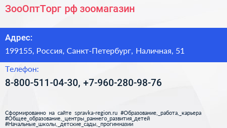 ЗооОптТорг.рф, зоомагазин по адресу 199155, Россия, Санкт-Петербург, Наличная, 51 в дальнейшем Организация, размещена в следующих категориях: