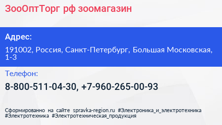 ЗооОптТорг.рф, зоомагазин по адресу 191002, Россия, Санкт-Петербург, Большая Московская, 1-3 в дальнейшем Организация, размещена в следующих категориях: