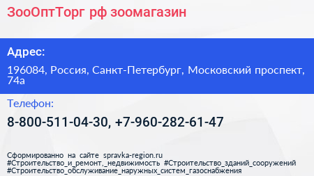 ЗооОптТорг.рф, зоомагазин по адресу 196084, Россия, Санкт-Петербург, Московский проспект, 74а в дальнейшем Организация, размещена в следующих категориях: