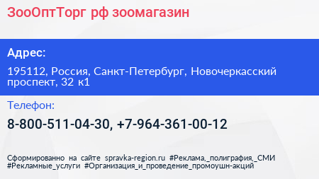 ЗооОптТорг.рф, зоомагазин по адресу 195112, Россия, Санкт-Петербург, Новочеркасский проспект, 32 к1 в дальнейшем Организация, размещена в следующих категориях: