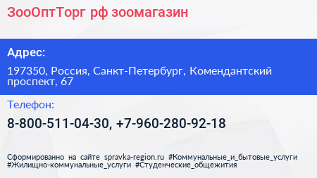 ЗооОптТорг.рф, зоомагазин по адресу 197350, Россия, Санкт-Петербург, Комендантский проспект, 67 в дальнейшем Организация, размещена в следующих категориях:
