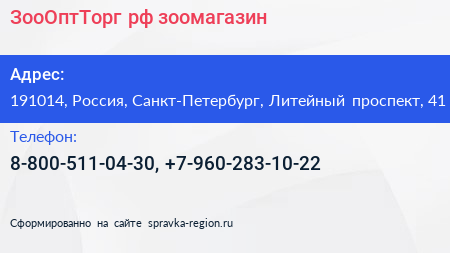 ЗооОптТорг.рф, зоомагазин по адресу 191014, Россия, Санкт-Петербург, Литейный проспект, 41 в дальнейшем Организация, размещена в следующих категориях: