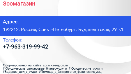 Зоомагазин по адресу 192212, Россия, Санкт-Петербург, Будапештская, 29 к1 в дальнейшем Организация, размещена в следующих категориях: