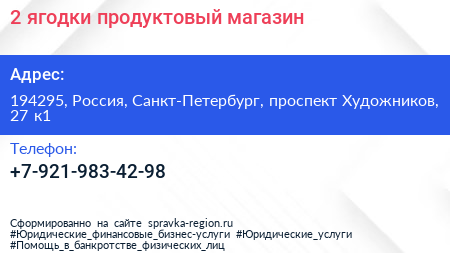 2 ягодки, продуктовый магазин по адресу 194295, Россия, Санкт-Петербург, проспект Художников, 27 к1 в дальнейшем Организация, размещена в следующих категориях:
