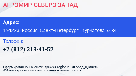 АГРОМИР СЕВЕРО-ЗАПАД по адресу 194223, Россия, Санкт-Петербург, Курчатова, 6 к4 в дальнейшем Организация, размещена в следующих категориях: