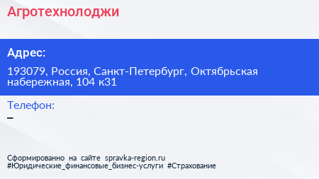 Агротехнолоджи по адресу 193079, Россия, Санкт-Петербург, Октябрьская набережная, 104 к31 в дальнейшем Организация, размещена в следующих категориях:
