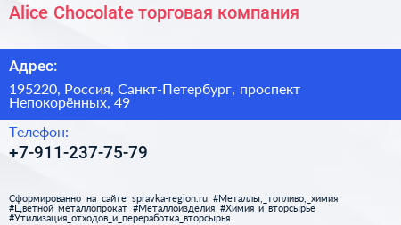 Alice Chocolate, торговая компания по адресу 195220, Россия, Санкт-Петербург, проспект Непокорённых, 49 в дальнейшем Организация, размещена в следующих категориях: