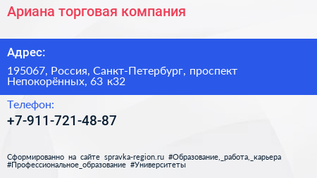 Ариана, торговая компания по адресу 195067, Россия, Санкт-Петербург, проспект Непокорённых, 63 к32 в дальнейшем Организация, размещена в следующих категориях: