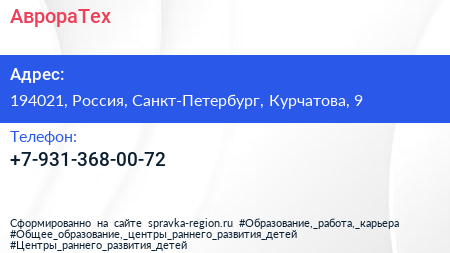 АврораТех по адресу 194021, Россия, Санкт-Петербург, Курчатова, 9 в дальнейшем Организация, размещена в следующих категориях: