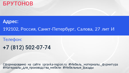 БРУТОНОВ по адресу 192102, Россия, Санкт-Петербург, Салова, 27 лит И в дальнейшем Организация, размещена в следующих категориях: