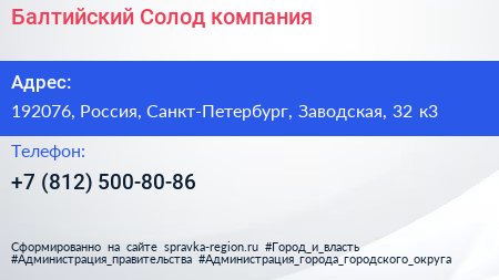 Балтийский Солод, компания по адресу 192076, Россия, Санкт-Петербург, Заводская, 32 к3 в дальнейшем Организация, размещена в следующих категориях: