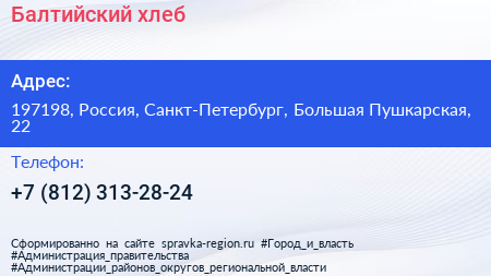 Балтийский хлеб по адресу 197198, Россия, Санкт-Петербург, Большая Пушкарская, 22 в дальнейшем Организация, размещена в следующих категориях: