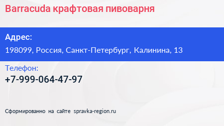 Barracuda, крафтовая пивоварня по адресу 198099, Россия, Санкт-Петербург, Калинина, 13 в дальнейшем Организация, размещена в следующих категориях: