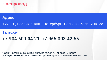 Чаепровод по адресу 197110, Россия, Санкт-Петербург, Большая Зеленина, 28 в дальнейшем Организация, размещена в следующих категориях: