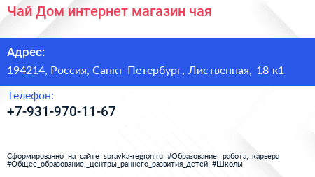 Чай & Дом, интернет-магазин чая по адресу 194214, Россия, Санкт-Петербург, Лиственная, 18 к1 в дальнейшем Организация, размещена в следующих категориях: