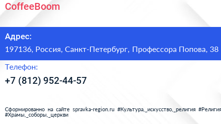 CoffeeBoom по адресу 197136, Россия, Санкт-Петербург, Профессора Попова, 38 в дальнейшем Организация, размещена в следующих категориях: