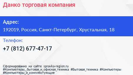 Данко, торговая компания по адресу 192019, Россия, Санкт-Петербург, Хрустальная, 18 в дальнейшем Организация, размещена в следующих категориях: