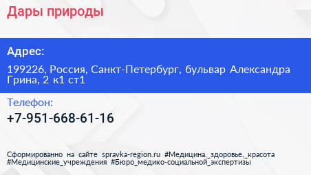 Дары природы по адресу 199226, Россия, Санкт-Петербург, бульвар Александра Грина, 2 к1 ст1 в дальнейшем Организация, размещена в следующих категориях: