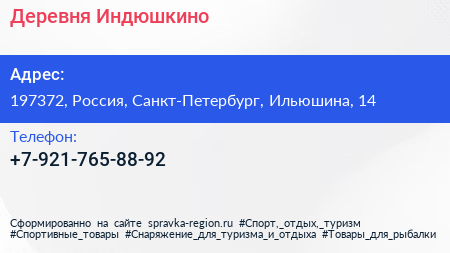Деревня Индюшкино по адресу 197372, Россия, Санкт-Петербург, Ильюшина, 14 в дальнейшем Организация, размещена в следующих категориях: