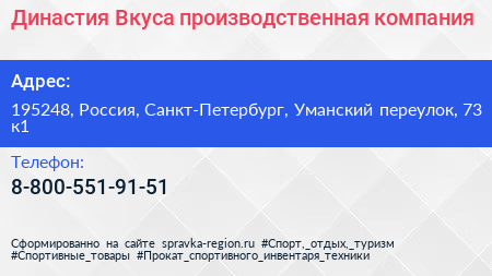 Династия Вкуса, производственная компания по адресу 195248, Россия, Санкт-Петербург, Уманский переулок, 73 к1 в дальнейшем Организация, размещена в следующих категориях: