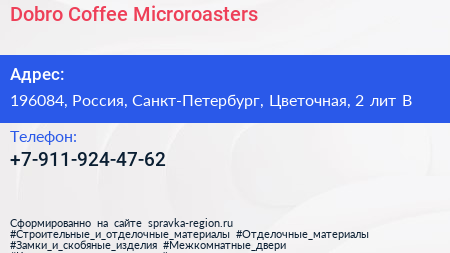 Dobro Coffee Microroasters по адресу 196084, Россия, Санкт-Петербург, Цветочная, 2 лит В в дальнейшем Организация, размещена в следующих категориях: