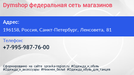 Dymshop, федеральная сеть магазинов по адресу 196158, Россия, Санкт-Петербург, Ленсовета, 81 в дальнейшем Организация, размещена в следующих категориях: