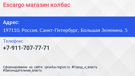 Escargo, магазин колбас по адресу 197110, Россия, Санкт-Петербург, Большая Зеленина, 5 в дальнейшем Организация, размещена в следующих категориях: