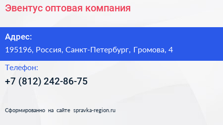 Эвентус, оптовая компания по адресу 195196, Россия, Санкт-Петербург, Громова, 4 в дальнейшем Организация, размещена в следующих категориях: