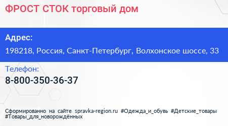 ФРОСТ СТОК, торговый дом по адресу 198218, Россия, Санкт-Петербург, Волхонское шоссе, 33 в дальнейшем Организация, размещена в следующих категориях: