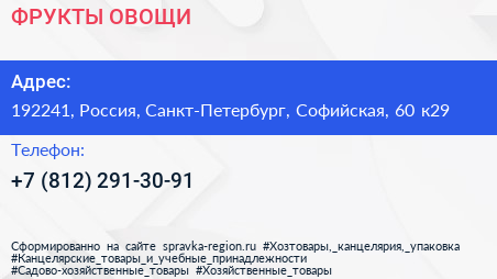 ФРУКТЫ ОВОЩИ по адресу 192241, Россия, Санкт-Петербург, Софийская, 60 к29 в дальнейшем Организация, размещена в следующих категориях: