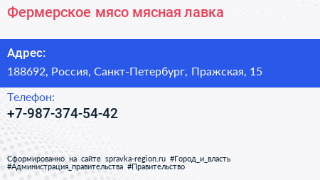 Фермерское мясо, мясная лавка по адресу 188692, Россия, Санкт-Петербург, Пражская, 15 в дальнейшем Организация, размещена в следующих категориях: