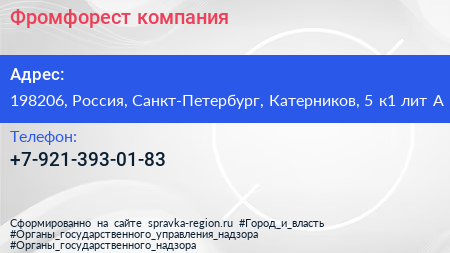 Фромфорест, компания по адресу 198206, Россия, Санкт-Петербург, Катерников, 5 к1 лит А в дальнейшем Организация, размещена в следующих категориях: