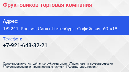 Фруктовиков, торговая компания по адресу 192241, Россия, Санкт-Петербург, Софийская, 60 к19 в дальнейшем Организация, размещена в следующих категориях: