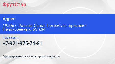 ФрутСтар по адресу 195067, Россия, Санкт-Петербург, проспект Непокорённых, 63 к34 в дальнейшем Организация, размещена в следующих категориях: